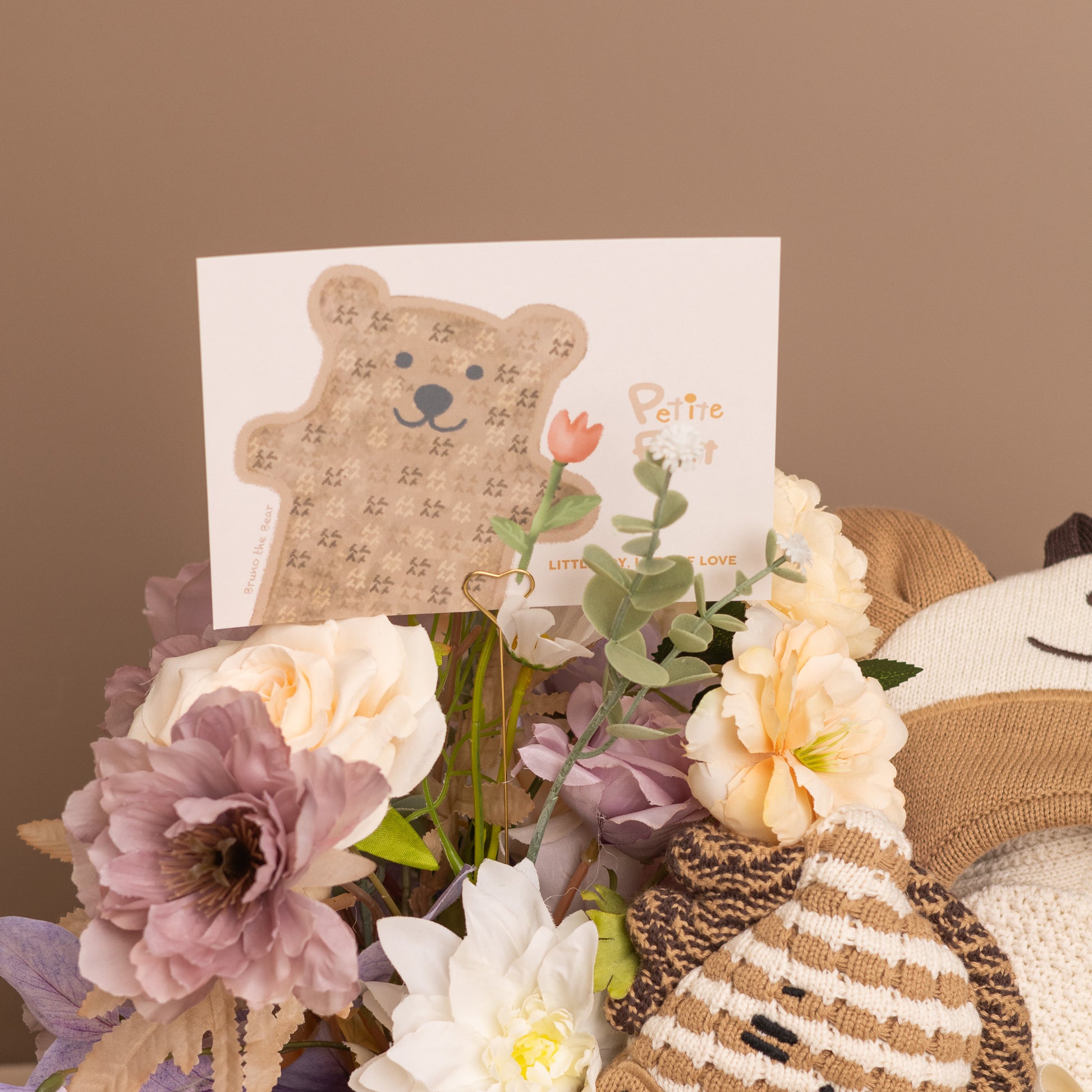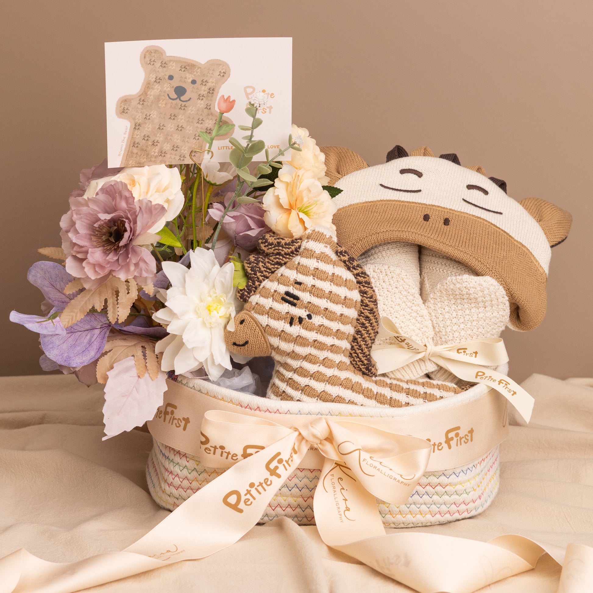 Celebrate the arrival of your little one with our elegantly curated baby hamper, featuring loving Petite Friend, super soft baby blanket and exquisite silk flowers.